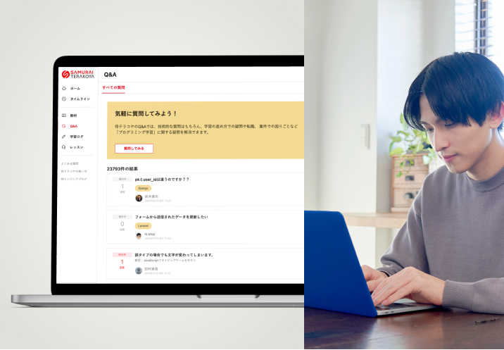 SAMURAI ENGINEERでは、専属のインストラクターだけでなく、Q&Aサイトであなたの学習のサポートを行います。